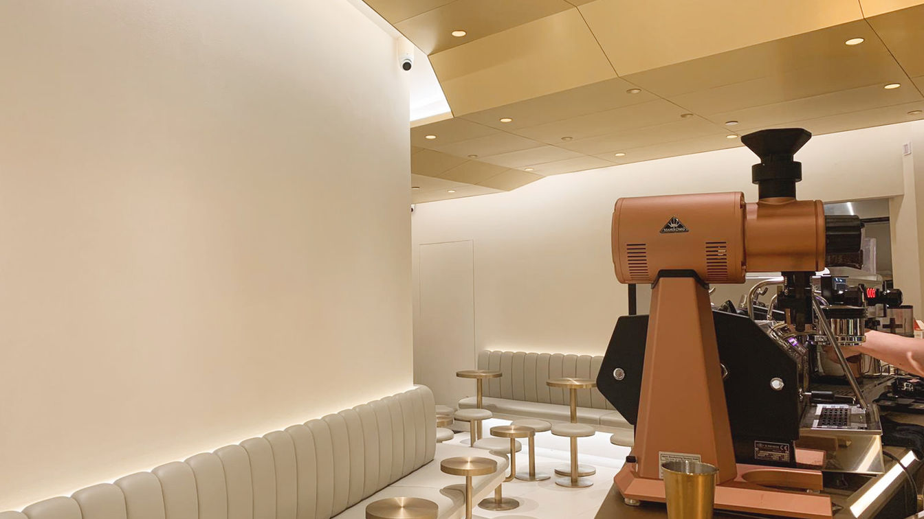 是次在Blooms Coffee的案例中呈現了磨砂質感,其中以米白色作為主色調,塗層上使用了多層批刮的技術製作出層次。在空間的撘配上,不難看出設計師強調的極簡主義類視覺元素。