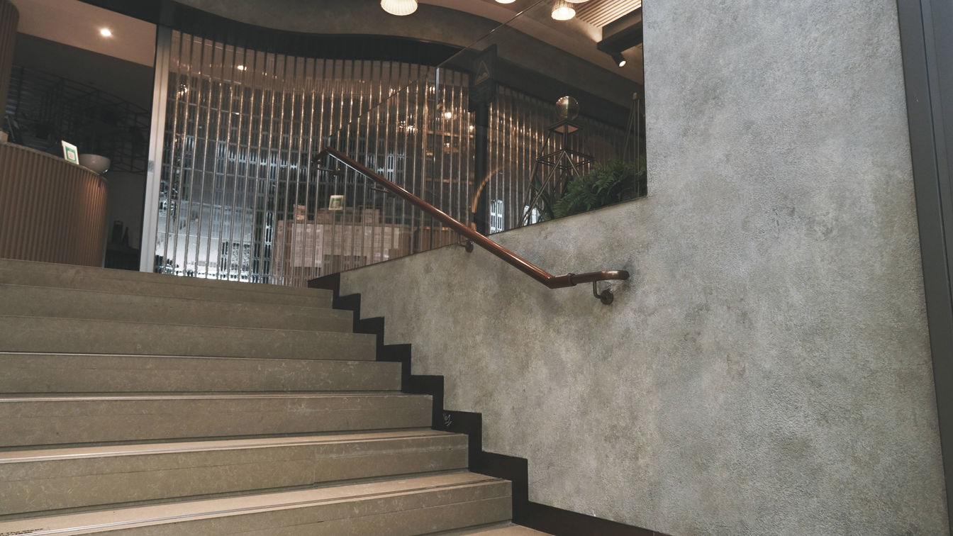 是次在K11 Musea的案例中呈現了混合水泥質感,其中以灰白和米黃作為主色調,塗層上使用了色彩重疊的技術製作出層次。在空間的撘配上,不難看出設計師強調的金屬類視覺元素,處處可見玫瑰色金屬框與水泥牆形成的對比。一般而言水泥牆具有工業風特色,並帶有隨性及自然的感覺。相較之下,玫瑰色金屬框則帶出隆重感,兩者的合併下產生了新穎優雅的風格,隆重而不失個性。